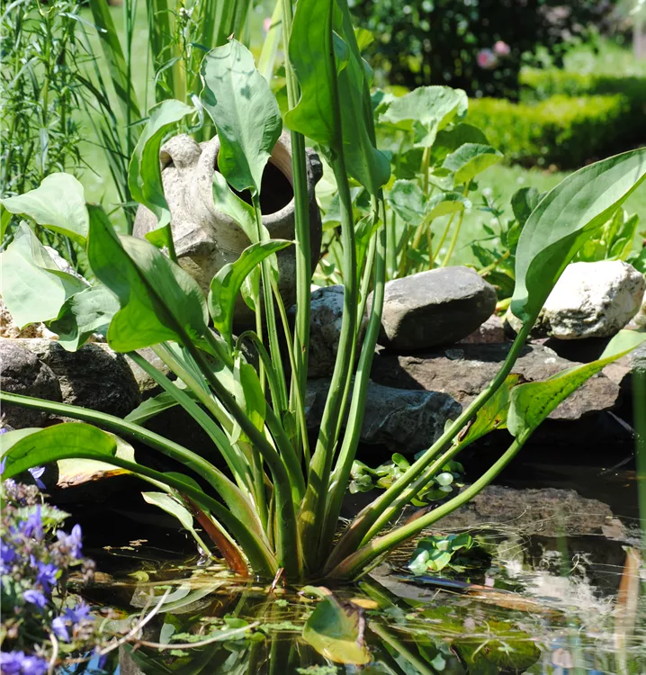 Ein Teich im Garten bekommt durch den Gewöhnlicher Froschlöffel (Alisma plantago-aquatica) einen wunderbaren Charme. Ein Blickfang sind natürlich seine Blüten, die er von Juni bis August in attraktivem Hellrosa hervorbringt. Auch für viele Insekten sind die Blüten interessant, da sie eine willkommene Nahrungsquelle darstellen. Dazu trägt diese aufrechte und horstbildende Wasserpflanze dunkelgrüne, lanzettliche Blätter. Besonders gut kann sich der Gewöhnlicher Froschlöffel in einer sonnigen bis halbschattigen Lage entwickeln. Dabei sollte der Teich schon eine Wassertiefe von 5 - 40 cm haben und optimaler Weise auch einen humosen, nährstoffreichen Grund, damit sich diese Wasserpflanze darin verwurzeln kann. Er wird dann bis zu 1 m hoch und 50 cm breit.
