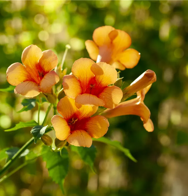 An Kletterhilfen oder als Fassadenbegrünung geht die kletternd wachsende Tromepetenblume 'Indian Summer'® in die Höhe. Bis zu 4 m kann sie dabei erreichen. Dabei setzt sie bereits mit ihrem sommergrünen Laub Akzente, dessen gefiederte Blätter eine schöne mittelgrüne Farbe haben. Von Juni bis Oktober sind es jedoch ihre orange-roten, trichterförmigen Blüten, die die Blicke auf sich ziehen. Ihr angenehmer Duft trägt ebenso zu ihrer Wirkung bei. Optimal entwickelt sich die Tromepetenblume 'Indian Summer'®, wenn Sie ihr einen sonnigen bis halbschattigen Standort geben und sie dabei in durchlässige und nährstoffreiche Erde setzen.