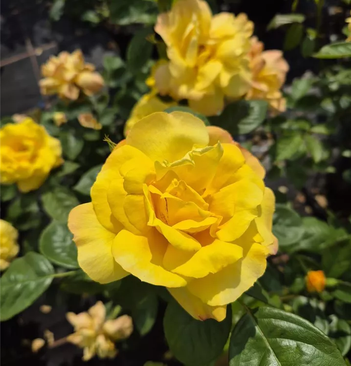 Die Strauchrose 'Chinatown'® schätzt eine regelmässige Wasserversorgung, die Erde darf aber auch mal antrocknen.