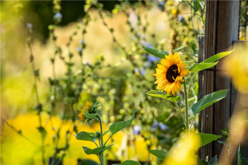 Sonnenblumen sind wahre Stars im Garten. Zusammen mit anderen Sommerblühern sorgen sie für gute Laune und ausgelassene Stimmung. Kein Wunder also, dass sie in nahezu jedem Garten zu finden sind. Die unterschiedlichen Arten und Sorten ermöglichen mit ihrem Aussehen sogar, dass der ganze Garten mit den hübschen Sommerblumen geschmückt werden kann. Und nicht nur im Bauerngarten sind sie ein fester Bestandteil. Auch in Präriegärten und Naturgärten sind sie sehr beliebt. Besonders praktisch sind die grossen Sorten für die Begrünung von Zäunen und als Sichtschutz. Zwar muss man diese Sonnenblumen jedes Jahr erneut aussäen, aber sie sorgen damit immer wieder für blühende Highlights. Was die Blüten noch aussergewöhnlich macht? Sie richten sich immer nach der Sonne und drehen ihre Blüten der Sonne entgegen. Das sollte man bei der Standortwahl beachten und den Pflanzen im wahrsten Sinne des Wortes einen Platz an der Sonne gönnen. Auch auf dem Balkon ist das wichtig, damit sich die Pflanzen gesund und prächtig entwickeln. Wichtig ist beim sonnigen Standort aber eine ausreichende Bewässerung. Mit Trockenheit kommen die Sommerblumen nämlich nicht zurecht. Auch Staunässe gilt es zu vermeiden. Daher sollten Kübel immer über ein Abzugsloch verfügen, durch das überschüssiges Wasser abfliessen kann.