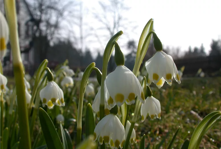 Auch der schattenliebende Märzenbecher Leucojum vernum erscheint in einem weissen Blütenkleid. Seine Blütezeit ist allerdings etwas später als die des Schneeglöckchens, mit welchem er gern einmal verwechselt wird. Daher ist er unter anderem als „Grosses Schneeglöckchen“ bekannt geworden. Doch die Frühlings-Knotenblume, wie der Märzenbecher aufgrund seines unübersehbaren Fruchtknotens ebenfalls genannt wird, hat ihren grossen Auftritt von Ende Februar bis April. Die etwas breiteren Blütenblätter des Märzenbechers weisen an ihren Spitzen grün-gelbe Farbtupfer auf, die an ein umgedrehtes „V“ erinnern. Das Schneeglöckchen entwickelt hingegen schmale und unterschiedlich lange Blütenblätter, von denen nur die kürzeren ebenfalls gelb-grüne Spitzen aufweisen. Frühblühende Zwiebelblumen wie das Schneeglöckchen oder der Märzenbecher Leucojum vernum ziehen nach ihrer Blütezeit wieder in den Boden ein und erscheinen erst im nächsten Vorfrühling wieder. Die mehrere Zentimeter grossen Blumenzwiebeln haben dabei die Funktion eines Überdauerungsorgans, welches auch während klimatisch ungünstiger Bedingungen für das Überleben der Pflanze sorgt. Zudem dient die Zwiebel als Speicherorgan für wichtige Nährstoffe.