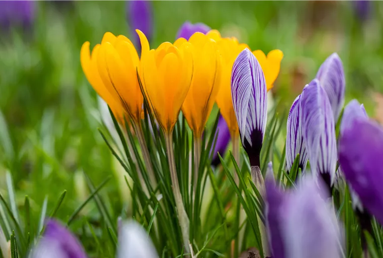 Kaum ein Frühblüher bringt zwischen Februar und März mehr unterschiedliche Farben in den Garten als der Frühlingskrokus. Den Crocus vernus gibt es vor allem in Lila, Gelb, Blau und Weiss. Er wird bis zu 15 Zentimeter hoch und liebt einen sonnigen bis halbschattigen Standort. Der Boden darf gern leicht sandig und nicht zu fest sein – dann fühlt er sich am wohlsten. Die zart duftenden Blüten erscheinen beinahe über Nacht und trotzen Regennässe, Schnee und Kälte. Doch nicht nur im Garten zieht der frostharte Frühlingskrokus alle Blicke auf sich. Auch im Pflanzkübel macht der aufrechtwachsende Crocus vernus eine gute Figur. Am schönsten wirkt er, wenn Sie ihn nicht zu dicht in kleineren Gruppen pflanzen. Er verträgt sich auch gut mit anderen Frühblühern wie dem Schneeglöckchen oder dem Märzenbecher, wo seine reiche Farbenvielfalt besonders schön zur Geltung kommt. Pflanzen können Sie den Frühlingskrokus meist – je nach Sorte – im zeitigen Herbst und bei frostfreiem Boden.
