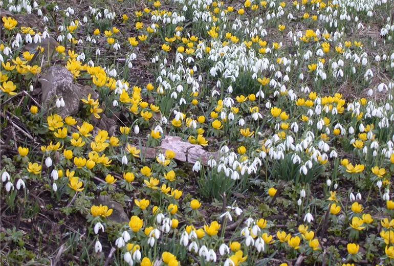 Eines der wohl beliebtesten Frühblüher ist das kleine Schneeglöckchen, das sein Köpfchen bereits ab Anfang Februar durch die Schneedecke steckt. Mit seinen weissen, nach unten hängenden Blütenglöckchen verzückt es jedes Jahr Gross und Klein gleichermassen. Dieser kleine Vorfrühlingsbote mit dem botanischen Namen Galanthus nivalis gehört zu den ersten Blumen, die zu dieser Jahreszeit erwachen. Einmal gepflanzt, erscheint es jedes Jahr von allein wieder. Dabei ist das Schneeglöckchen absolut pflegeleicht und nahezu anspruchslos, was seinen Standort angeht. Ob in der Sonne oder im Vollschatten, der feuchten Wiese, unter Sträuchern und Büschen oder mitten durch die winterliche Schneedecke hindurch: Das aufrechtstehende Schneeglöckchen Galanthus nivalis fühlt sich zu dieser Jahreszeit überall zu Hause. Dabei benötigt es nicht einmal Dünger, um jedes Jahr wieder zuverlässig als eines der ersten Frühblüher im Garten zu erscheinen. Wenn Sie gleich mehrere Schneeglöckchen in Gruppen zusammen mit farbenfrohen Krokussen oder Winterlingen pflanzen, blühen alle zur gleichen Zeit in den unterschiedlichsten Farben.