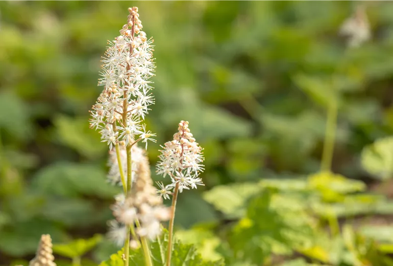 Die Schattenstaude Tiarella cordifolia gibt es in etlichen Sorten mit unterschiedlich farbigen Blütenständen. Eine besonders beliebte Sorte ist die „Spring Symphony“ mit ihren cremeweissen bis zart-rosa Blütenständen, die aus jedem schattigen Eckchen einen ansprechenden Blütenteppich zaubert. Doch auch die Hybridpflanze 'Angel Wings' gehört zu den schattenliebenden Tiarella-Stauden und gilt aufgrund ihrer zartrosa Blüten als eine der schönsten Bodendecker für halbschattige Standorte. Allen Tiarellas gemeinsam ist der längliche Blütenstiel, an welchem die Blüten traubenartig ihre Köpfe nach oben strecken. Von April bis Mai lockt die Schaumblüte, wie diese kriechende Schattenstaude genannt wird, zahlreiche Bienen, Hummeln und andere Nützlinge in Ihren Garten.