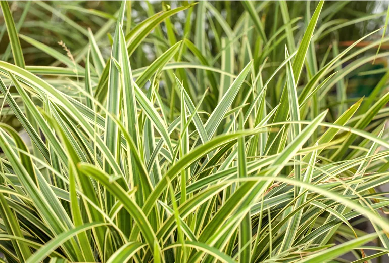Aufgrund ihres charakteristischen Aussehens erinnert die weissrandige Japan-Segge Carex morrowii Ice Dance ein wenig an die Grünlilie. Tatsächlich handelt es sich bei der Japan-Segge ebenfalls um ein Gras, welches durch weisse bis gelbliche Blattränder auffällt. Die Sorte 'Ice Dance' ist wintergrün und ein idealer Bodendecker für grössere Flächen mit nur wenig Sonne. Mit ihren zahlreichen Ausläufern bildet sie rasch einen blickdichten Teppich und verhindert so zuverlässig das Aufkommen von Unkräutern. Die aufrechtwachsenden, leicht überhängenden und lanzettlichen Blätter erreichen eine Wuchshöhe von bis zu 30 Zentimetern. Diese horstbildende Staude passt optisch gut zu Funkien und anderen schattenliebenden Pflanzen. Die Blüten der Japan-Segge Carex morrowii Ice Dance sind eher unscheinbar. Dafür sind die bogenartig überhängenden Blätter umso eindrucksvoller. Die Pflanze bevorzugt einen halbschattigen bis schattigen und windgeschützten Standort. Sie können die Japan-Segge auch als Kübelpflanze halten, wo ihre langen, leicht herabhängenden Blätter besonders gut zur Geltung kommen.