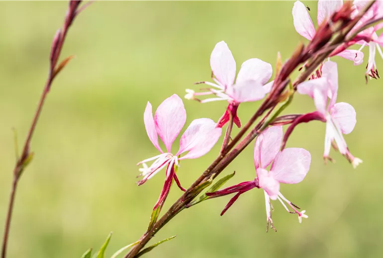Der botanische Name der eleganten Pracht- oder Präriekerze lautet Gaura lindheimeri. Diese attraktive Sommerstaude hat etwas ganz Besonderes zu bieten. Sie öffnet jede ihrer einzelnen Blüten nur für einen einzigen Tag. Dennoch ist diese Blume ein Dauerblüher, denn sie entwickelt den ganzen Sommer über bis zum späten Herbst durchgehend neue Knospen und Blüten. Dank ihrer schmalen und aufrechtstehenden Stängel findet diese filigrane Schönheit überall ein Plätzchen, welches sie mit ihrer zarten Blüte bereichern kann. Die Prachtkerze wird maximal bis zu 1,5 Meter hoch und etwa 90 Zentimeter breit. Sie entwickelt blaugrüne Blätter und üppige Blütenrispen. Die einzelnen Blüten sind meist weiss-rosa gefärbt und fallen vor allem durch ihre schmetterlingsartige Form auf. Die Gaura lindheimeri kann in grösseren Gruppen gepflanzt, aber auch mit anderen farbenfrohen, mehrjährigen Blumen kombiniert werden. Im Balkonkasten oder Pflanzkübel kommt diese anmutige Staude mit ihrer durchgehenden Blütenpracht ebenfalls gut zur Geltung.