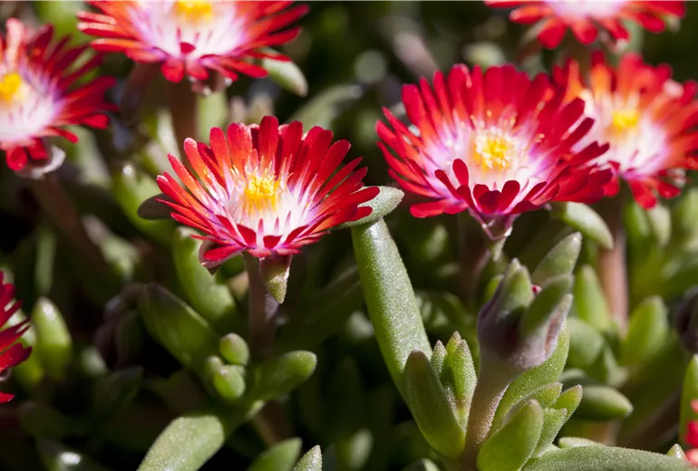 Die Mittagsblume – botanisch Delosperma – öffnet ihre farbenfrohen Korbblüten erst mit den ersten Sonnenstrahlen am Morgen. Diese schliessen sich wieder, wenn die Sonne untergeht. Die Delosperma gibt es in den unterschiedlichsten Farben – von Rot über Rosa, Gelb und sogar Weiss. Die Pflanze gehört zu den sukkulenten Blumen und Dauerblühern, was Sie an ihren halbrunden, dickfleischigen Blättern erkennen können. Mit diesen ist sie in der Lage, Feuchtigkeit zu speichern und muss daher weniger häufig gegossen werden. Mit ihren etwa 15 Zentimetern Wuchshöhe eignet sich die Mittagsblume auch für Blumenbeete und Steingärten.