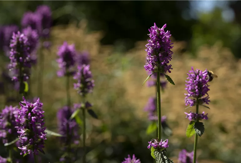 Eine weitere mehrjährige Schönheit mit leuchtenden Blüten in Rosa-Violett ist das Patagonische Eisenkraut. Diese aufrechtwachsende Blume hat einen kräftigen Stängel, an dessen oberen Ende die auffälligen, etwa fünf Zentimeter breiten Trugdolden sitzen. Die gegenständig angeordneten Blätter können eine Länge von mehr als 12 Zentimetern erreichen und sind lanzettartig geformt. Von Juli bis in den späten Herbst hinein blüht das Patagonische Eisenkraut mit dem botanischen Namen Verbena bonariensis und gilt damit als besonders bienenfreundlich. Selbst die ersten Frostnächte- und Tage machen dieser filigran wirkenden Schönheit nichts aus, doch im kalten Winter sollten Sie dieser Pflanze dennoch einen leichten Winterschutz gönnen.