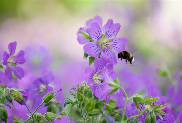 Der filigrane Storchenschnabel gehört zu den beliebtesten Blumen und Dauerblühern im Garten. Mit der Hybride Geranium Rozanne haben Sie nun eine weitere Storchenschnabelarten, die lange Triebe entwickelt, mit welchen die Pflanze kleinere Gehölze und Sträucher erklimmen kann. Seine blau-violetten Blüten zeigt der Storchenschnabel Geranium Rozanne von Ende Mai bis November, womit er eine aussergewöhnlich lange Blütezeit besitzt. Auch seine herausragende Winterhärte macht diesen wenig pflegeintensiven Storchenschnabel Rozanne zu einer der begehrtesten Storchschnabelarten unter diesen Garten- und Wiesenschönheiten. Denn diese mehrjährige Staude verträgt Minusgrade bis zu -20°C und ist damit ungewöhnlich robust und frosthart. Ihr schnelles Wachstum, das mit den Jahren kaum nachlässt, ist eine weitere besondere Eigenschaft dieser kriechenden und kletternden Gartenpflanze. Dem schlanken Stängel machen dabei auch kräftigere Winde nichts aus. Zudem sind nicht nur die Storchenschnabelblüten ein echter Blickfang. Die Blätter zeigen im Herbst ebenfalls ein herrliches Farbspiel in Gelb, Orange und Rostrot und verwandeln Ihren Garten in eine farbenfrohe Oase.
