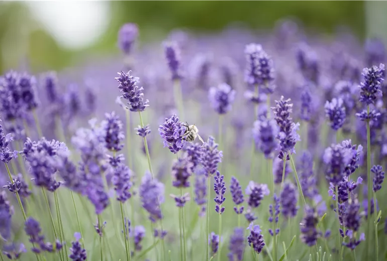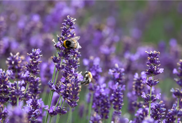 Die violett-blauen Blütenstände des Lavendula angustifolia 'Essence Purple' verströmen ebenfalls einen intensiven, charakteristischen Lavendelduft. Falls Sie noch keine Erfahrung mit der Pflege einer Lavendelpflanze haben, können Sie gern zu diesem pflegeleichten Provence-Lavendel greifen. Er hat in Bezug auf Pflege und Bodenbeschaffenheit kaum Ansprüche und muss nur selten gegossen werden. Der Boden sollte eher sandig und kalkhaltig sein, weshalb sich dieser Lavendel an einem sonnigen Platz an Mauern, in einem Steingarten oder in einem mediterranen Kräutergarten am wohlsten fühlt. Sie können den Lavendula angustifolia Essence Purple jedoch genauso gut im Kübel halten. Diese Lavendelart wird bis zu 80 Zentimeter hoch und ist ebenfalls ein beliebter Rosenbegleiter. Der Lavandula Essence Purple vertreibt mit seinem starken Duft Blattläuse und andere Schädlinge. Nützlichen Insekten wiederum dient der nektarreiche Provence-Lavendel als beliebte Nahrungsquelle. Diesen Lavendel können Sie das ganze Jahr über pflanzen, solange der Boden frostfrei ist. Ein regelmässiger Rückschnitt – vor allem nach der Blütezeit – fördert die Blütenbildung und einen schönen, kompakten Wuchs.