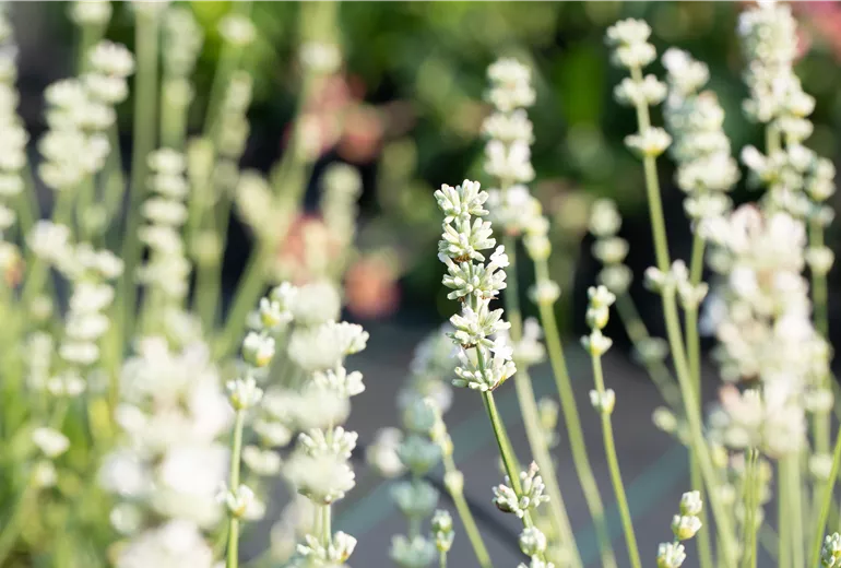 Eine eher ungewöhnliche Lavendelart ist der von Juli bis August blühende Lavandula oder Lavendula angustifolia 'Edelweiss'. Auch dieser überzeugt mit einer besonderen Winter- und Frosthärte und bevorzugt einen recht sonnigen Standort. Was ihn so aussergewöhnlich macht, ist die Farbe seiner Blüten. Denn – wie der Name schon vermuten lässt – handelt es sich beim Lavendula angustifolia 'Edelweiss'um eine Lavendelart mit weissen Blüten. Diese verströmen einen intensiv-würzigen Duft und locken damit zahlreiche Insekten an. Der Edelweiss-Lavendel wächst bis zu 40 Zentimeter hoch und wird in der Regel genauso breit. Die blaugrauen bis blaugrünen Blätter bilden einen schönen Kontrast zu den schneeweissen Blüten, die erst lange nach dem Verblühen ihr charakteristisches Aussehen verlieren. Besonders eindrucksvoll sieht es aus, wenn Sie diesen weiss blühenden Lavendel neben farbig blühende Lavendelarten pflanzen. Die getrockneten Blätter und Blüten des Edelweiss-Lavendels eignen sich natürlich auch für feine Potpourris, Tees oder als mediterranes Küchengewürz.