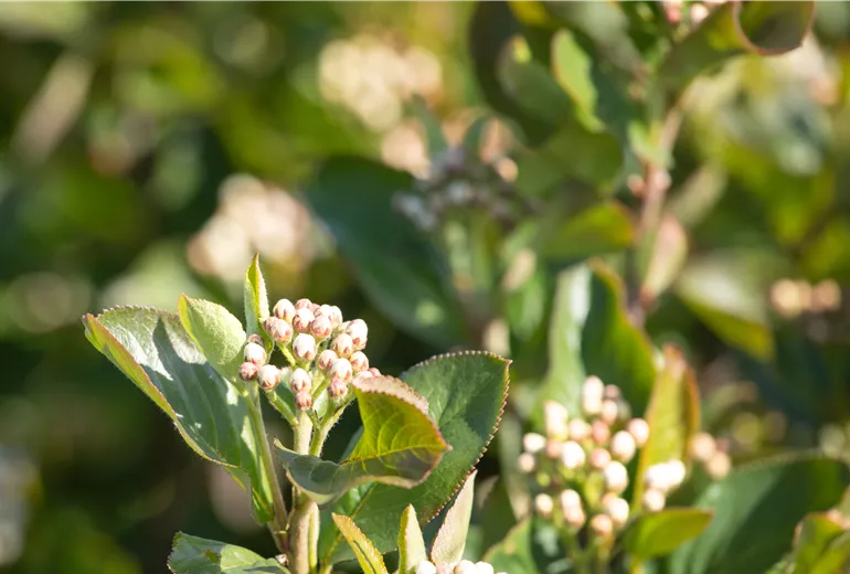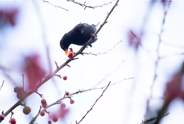 Die Gemeine Mehlbeere Sorbus aria gehört ebenfalls zu den heimischen Futterpflanzen für Gartenvögel in der Schweiz und kann bis zu 12 oder 15 Meter hoch werden. Ab Mai bis Juni zeigt die Echte Mehlbeere ihre cremefarbenen, schirmartigen und aufrechtwachsenden Blüten. Für die heimische Vogelwelt sind vor allem die orange-roten Früchte dieser Futterpflanze interessant. Diese reifen von August bis in den Herbst hinein und bleiben auch noch lange nach den ersten Frösten an den Trieben hängen. Ähnlich wie Hagebutten entwickeln die apfelförmigen kleinen Mehlbeeren ihr süss-säuerliches Aroma erst mit dem ersten Frost. Gern können Sie sich den Früchtesegen aber auch mit den Wildvögeln teilen. Roh sollten Sie die Früchte mit ihrem mehligen Fruchtfleisch jedoch nicht verzehren, denn sie enthalten die leicht toxische Parasorbinsäure. Diese wird durch das Erhitzen oder Trocknen bei der Weiterverarbeitung jedoch unschädlich gemacht. Mehlbeeren können daher zusammen mit Äpfeln, Quitten oder anderen Früchten zu Mus, Gelee und Marmelade verarbeitet werden.