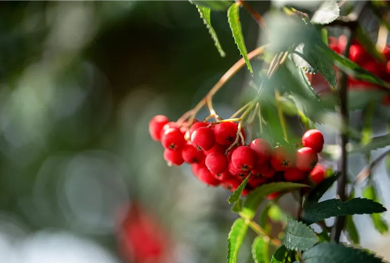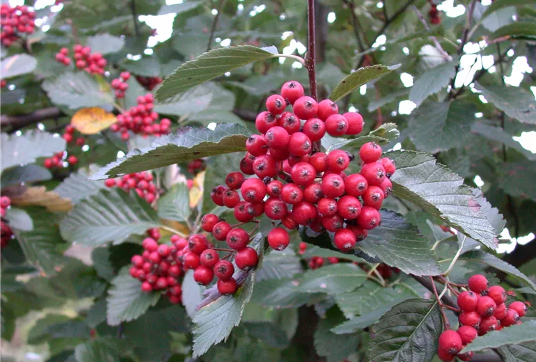 Die Vogelbeere oder Eberesche, wie der Baum mit dem botanischen Namen Sorbus aucuparia auch genannt wird, kann eine Wuchshöhe von bis zu 12 Metern erreichen und gehört ebenfalls zur Gattung der Mehlbeeren und vogelfreundlichen Futterpflanzen für Gartenvögel. Von Mai bis Juni fallen die weissen, in Rispen stehenden, schirmartigen Blüten ins Auge und verwandeln den Garten in eine wahre Blütenoase. Im Hochsommer bis in den Herbst hinein entwickeln sich nach und nach die zahlreichen leuchtend orange-roten Früchte der Vogelbeere, die zu den kulinarischen Leckerbissen der heimischen Vogelwelt gehören. Der Mensch wiederum darf diese vitaminreichen Beerenfrüchte ebenfalls nur in gekochtem Zustand zu sich nehmen, denn roh enthalten auch sie die leicht giftige Parasorbinsäure. Da die Früchte der Eberesche ohnehin recht sauer und herb-bitter sind, empfiehlt sich die Herstellung von Marmeladen oder Gelees aus den pektinreichen Ebereschenfrüchten gemeinsam mit süsseren Früchten wie reifen Äpfeln oder Birnen. Im Herbst zeigt die Eberesche ein dekoratives Farbenmeer aus gelben, orangen und roten Blättern.