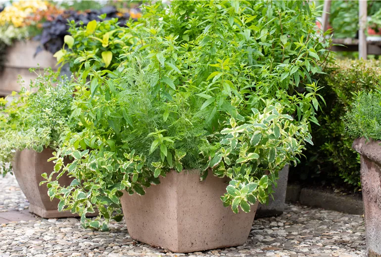 Angenehm unkompliziert ist die mehrjährige Zitronenmelisse, die auch im lichten Schatten gut wächst. Wird dieses Kraut vor der Blüte knapp über dem Boden gekappt, kann man bis zu drei Ernten erreichen. In Salaten, Suppen und Sossen wird gerne Kerbel verwendet, da er für ein feines Anis-Aroma sorgt. Kerbel wächst schnell und kann von März bis Juni alle drei bis vier Wochen neu ausgesät werden.
