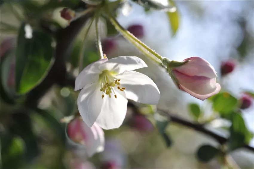 Ein Apfelbaum benötigt viel Raum, um sich im Laufe von Jahren und Jahrzehnten opulent zu entwickeln. Hochstämmige Apfelbäume brauchen oft mehr als 60 Quadratmeter Platz. Aus diesem Grund ist es nicht empfehlenswert, Apfelbäume zu eng aneinander oder in die Nähe von Gemüsebeeten zu pflanzen. Der Schattenwurf des Apfelbaums kann andere Pflanzen in ihrem Wuchs behindern. In kleinen Gärten empfehlen sich spezielle Säulenzüchtungen oder Spalierobst. Solche Apfelbäume benötigen weniger Spielraum und können daher auf grossen Terrassen oder auf kleinen Grundstücken viele Früchte tragen. Spalierobst macht im Schrebergarten oder in einem geräumigen Pflanztopf eine gute Figur und sorgt für eigene, schmackhafte Früchte. Generell gilt: Wer eine reiche Apfelernte im Blick hat, muss dafür sorgen, dass eine Befruchtung der Blüten möglich ist.