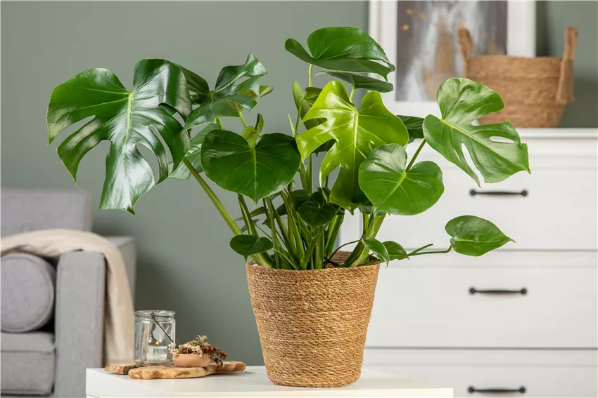 Besonders eindrucksvoll ist das Fensterblatt Monstera deliciosa mit seinen überdimensional grossen, geschlitzten Blättern. Diese Kletterpflanze kann eine Wuchshöhe von bis zu drei Metern erreichen, weshalb Sie ihre langstieligen Blätter und Triebe unbedingt an einem Moosstab fixieren sollten. Die einzelnen, dunkelgrünen und herzförmigen Blätter können bis zu einem halben Meter lang werden und weisen schlitzartige Löcher auf. Gönnen Sie der Monstera einen grossen Topf, denn je mehr Platz sie für ihre Wurzelbildung zur Verfügung hat, desto rascher wächst sie. Bei trockener und staubreicher Luft tut es ihren Blättern gut, wenn Sie diese mit einem feuchten Tuch abwischen. Diese tropische Kletterpflanze ist ebenso wie die meisten anderen Tropenschönheiten auch auf eine ausreichend hohe Luftfeuchtigkeit angewiesen, was Sie unbedingt beachten sollten, wenn Sie tropische Pflanzen zu Weihnachten verschenken wollen. Ein grosses Badezimmer mit Tageslicht ist daher der ideale Standort für die Monstera deliciosa. Aber auch im hellen Wohnzimmer gedeiht die Monstera, solange sie nicht unter einer sehr trockenen Heizungsluft leiden muss.