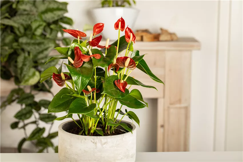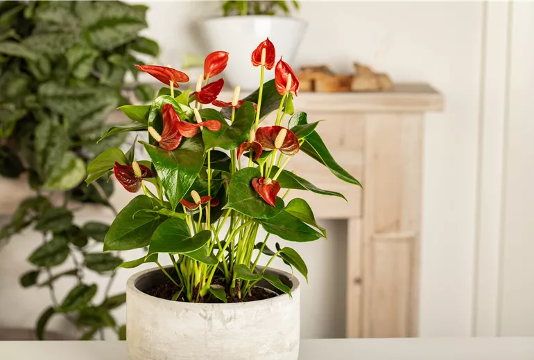 Auch die Flamingoblume Anthurium Andreanum lässt sich gut zu Weihnachten verschenken. Die ebenso als Grosse Flamingoblume bezeichnete Zimmerpflanze erinnert mit ihren roten Hochblättern und eher unauffälligen Blütenkolben tatsächlich an einen Flamingo und macht ihrem Namen damit alle Ehre. Selbst ohne ihre imposanten Hochblätter ist die Grosse Flamingoblume ein dekorativer Fensterschmuck. Allerdings muss der Standort optimal auf die Bedürfnisse dieser Pflanzenschönheit abgestimmt sein, damit ihre herzförmigen Blätter schön glänzen und sie sowohl neue Blüten als auch rote Hochblätter hervorbringt. So reagiert sie beispielsweise besonders empfindlich auf Zugluft, doch auch die trockene Heizungsluft bekommt ihren Blättern nicht gut. Sie bevorzugt ebenfalls eine eher hohe Luftfeuchtigkeit und liebt es, wenn ihre Blätter ab und zu mit zimmerwarmem Wasser besprüht werden. Sie revanchiert sich jedoch, indem sie für saubere und sauerstoffreiche Zimmerluft sorgt, denn die Flamingoblume gehört zu den besten Luftreinigern unter den Zimmerpflanzen. Vielleicht weisen Sie den Beschenkten einmal auf die positiven Eigenschaften der Flamingoblumen hin, wenn Sie diese Pflanzen zu Weihnachten verschenken.
