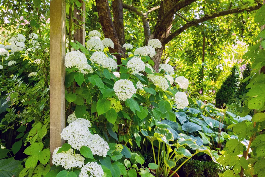 Die Schneeball-Hortensie ist in Nordamerika beheimatet und bildet die grössten Blütenstände unter den vielen Exemplaren der Hortensien. Je nach Sorte können sie einen Durchmesser von bis zu 25 Zentimetern erreichen, was für viele Zweige schon eine grosse Last werden kann.