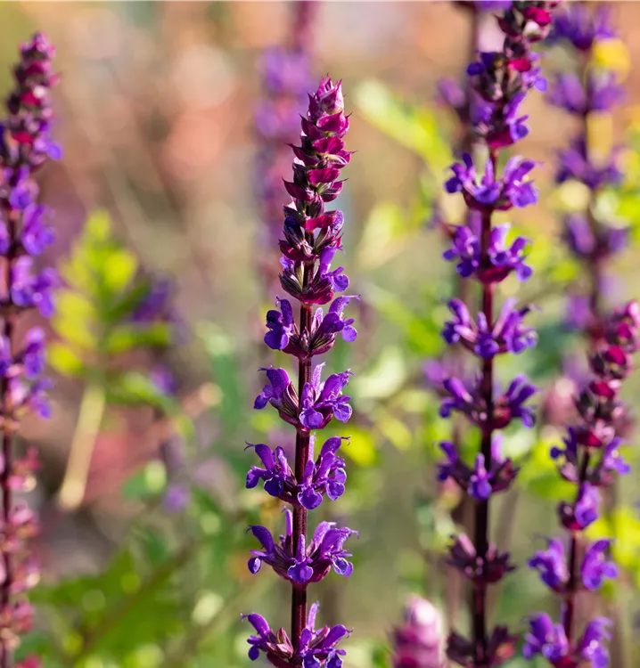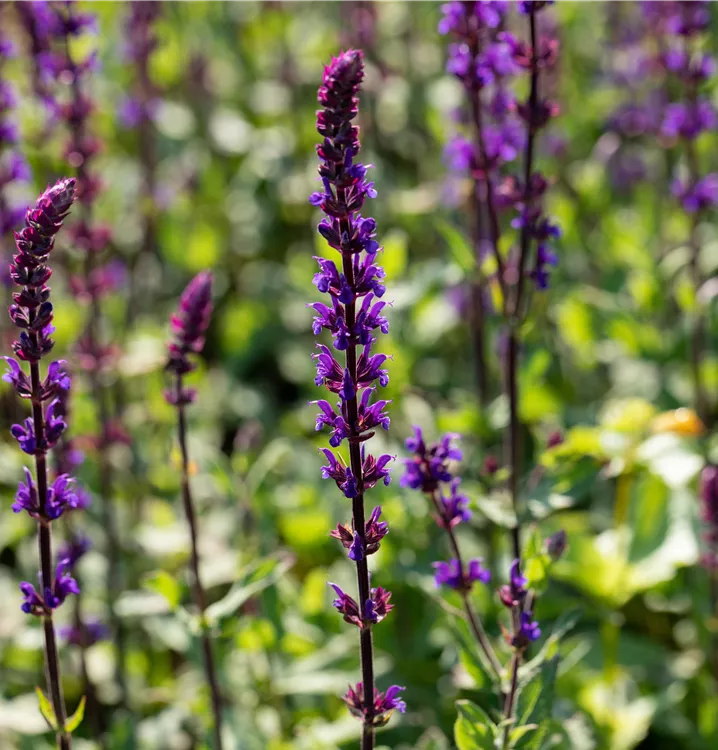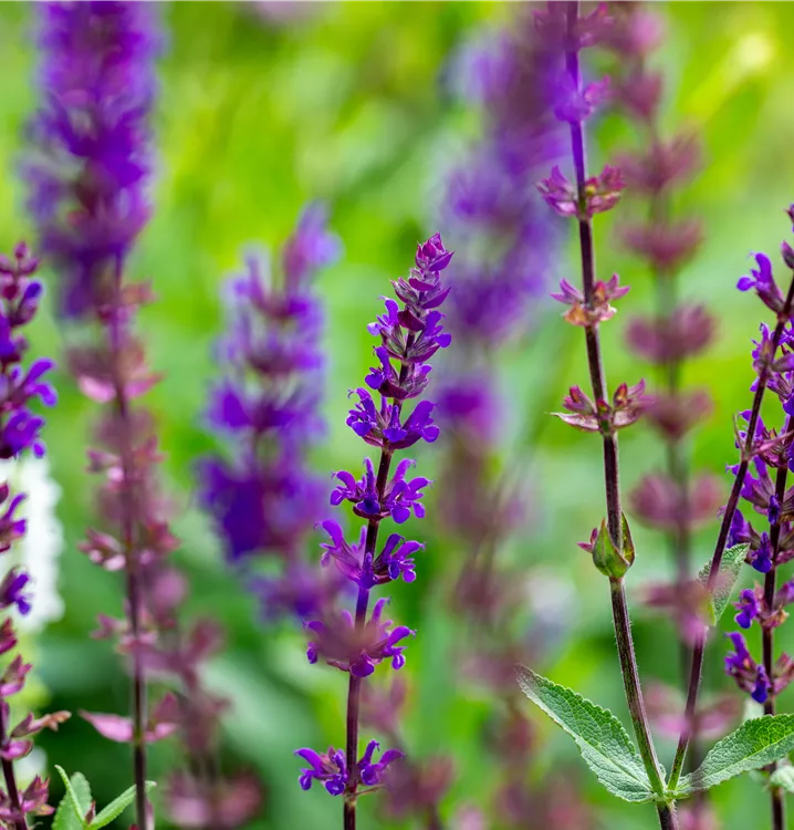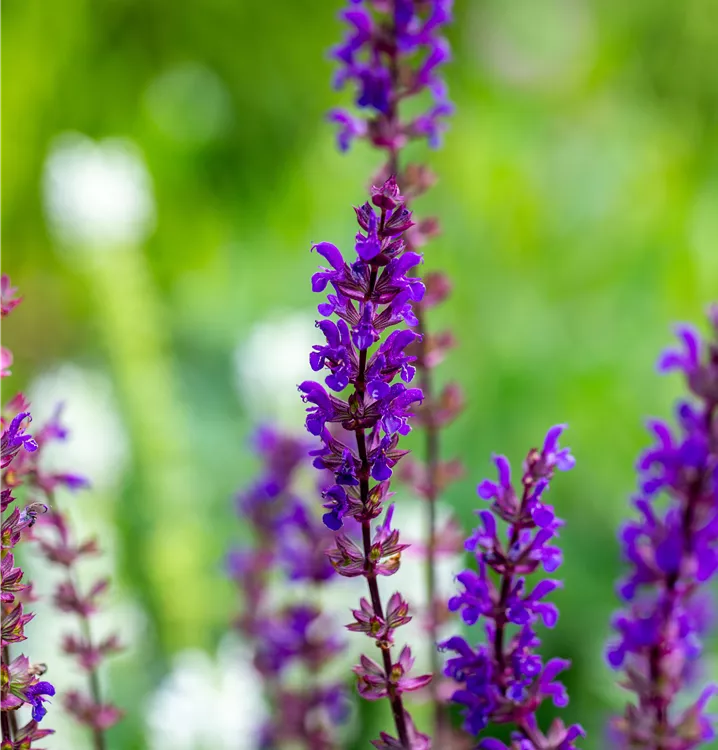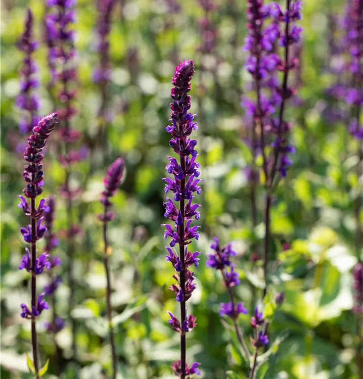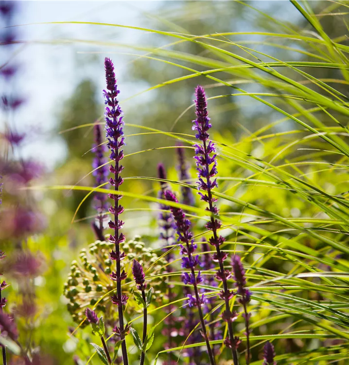 Beet und Rabatten lassen sich mit dem Garten-Blüten-Salbei 'Caradonna' (Salvia nemorosa) attraktiv gestalten. Dafür sorgen seine lippenförmigen Blüten, die von Juni bis Juli in schönstem Violett erscheinen. Abgerundet wird seine Erscheinung durch die lanzettlichen, mittelgrünen Blätter. Besonders geeignet ist der Garten-Blüten-Salbei 'Caradonna' für sonnige Standorte. Pflanzen Sie ihn in durchlässige, nährstoffreiche Erde und sorgen Sie immer für genügend Wasser, dann entwickelt sich diese Staude zu einem schönen, etwa 60 cm hohem und 40 cm breiten, aufrechten, schlanken Exemplar.