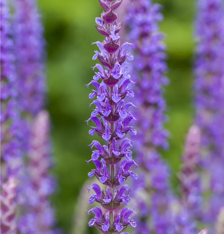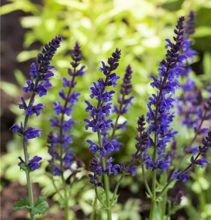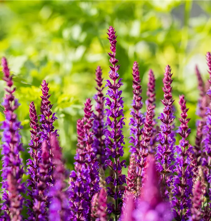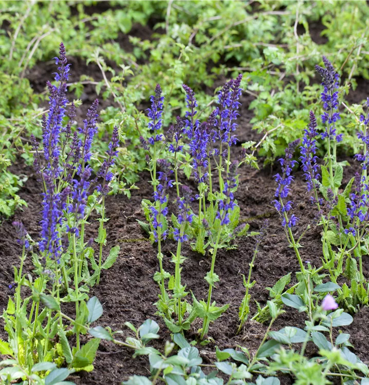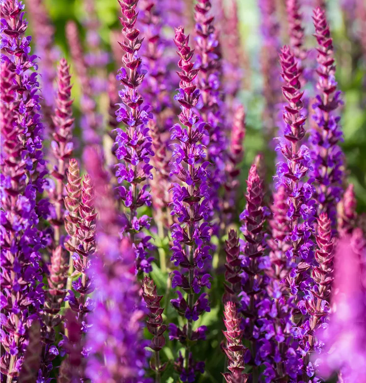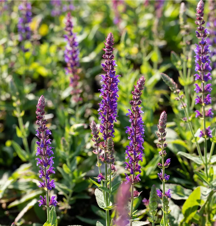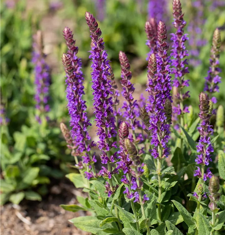 Beet und Rabatten lassen sich mit dem Garten-Blüten-Salbei 'Ostfriesland' (Salvia nemorosa) attraktiv gestalten. Dafür sorgen seine lippenförmigen Blüten, die von Juni bis Juli in schönstem Violett erscheinen. Abgerundet wird seine Erscheinung durch die lanzettlichen, mittelgrünen Blätter. Besonders geeignet ist der Garten-Blüten-Salbei 'Ostfriesland' für sonnige Standorte. Pflanzen Sie ihn in durchlässige, nährstoffreiche Erde und sorgen Sie immer für genügend Wasser, dann entwickelt sich diese Staude zu einem schönen, etwa 60 cm hohem und 40 cm breiten, buschigen, aufrechten Exemplar.