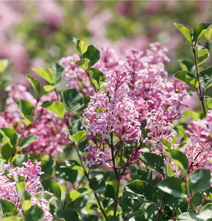 Der Flieder 'Miss Kim' (Syringa patula) trägt eiförmige, sommergrüne Blätter, die eine schöne dunkelgrüne Farbe haben. Im Herbst färben sie sich hingegen dunkelrot. Zwischen Mai und Juni bringt er purpurviolette Blüten mit angenehmem Duft hervor. Als kompakter, buschiger, dichter Strauch mit Krone erreicht der Flieder 'Miss Kim' Grössen von bis zu 2 m Höhe und 2 m Breite. Am besten kommt er zur Geltung, wenn Sie ihm einen sonnigen, windgeschützten Standort geben, optimalerweise mit durchlässigem, nährstoffreichem Boden und einer ausreichenden Wasserversorgung.
