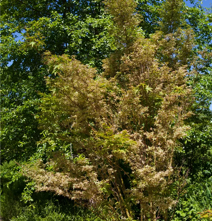 Le Erable palmé 'Butterfly' se développe en un grand arbuste ou un buisson à plusieurs troncs, en forme de parapluie, pittoresque, avec une couronne.