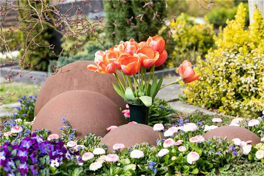 Les pâquerettes, les jonquilles, les myosotis et d'autres plantes à floraison précoce conviennent également à la décoration colorée des tombes.