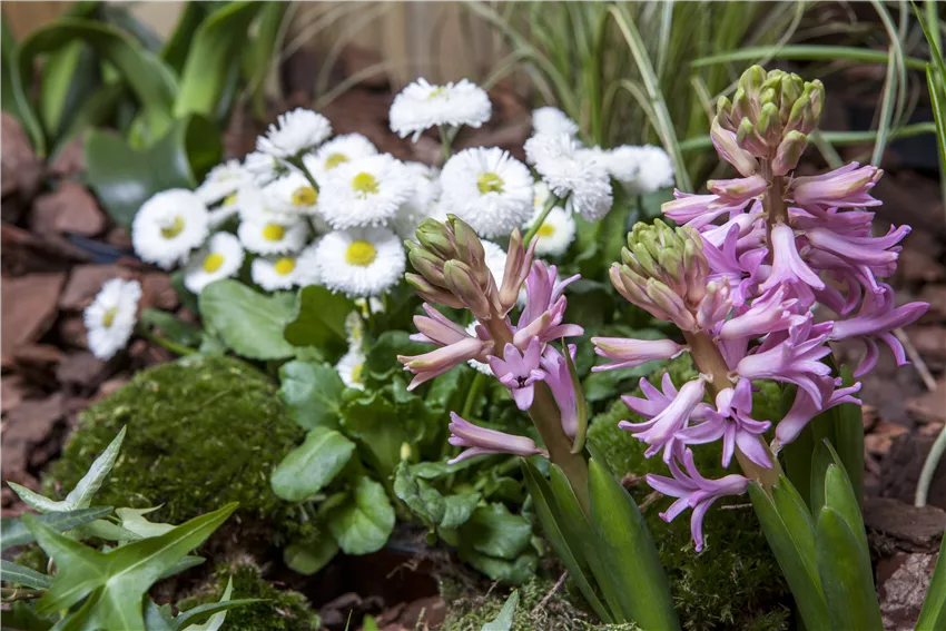 Les plantes à floraison printanière comme les jacinthes, font un plus bel effet si vous les plantez en petits groupes. Vous pouvez également placer des variétés plus petites de jacinthes dans un petit panier rempli de terreau et l'utiliser pour la plantation de tombes. Pour varier l'aménagement de la tombe, vous pouvez planter les jacinthes avec d'autres plantes à floraison précoce. Les pâquerettes, les jonquilles et la petite violette cornue sont recommandées. Lors de la plantation, veillez toujours à un espacement adéquat et assurez-vous que les plantes plus grandes ne cachent pas les plus petites, les laissant ainsi à l'ombre. Vous pouvez également diviser la tombe en différentes zones et les planter en conséquence, ce qui est particulièrement attrayant avec des plantes à fleurs.