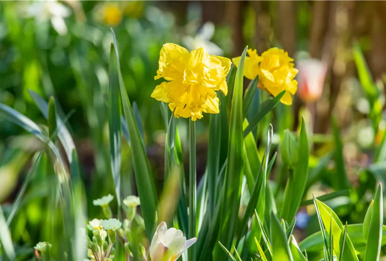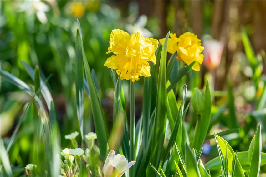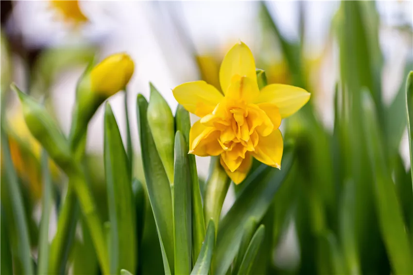 La jonquille ou narcisse jaune, dont le nom botanique est Narcissus pseudonarcissus, est un partenaire de plantation apprécié de la jacinthe, non seulement pour l'aménagement des tombes. La jonquille est également une fleur bulbeuse vivace qui montre ses magnifiques fleurs en forme de cloche au début du printemps. La principale période de floraison de cette fleur printanière s'étend de mars à avril. Ainsi, la jonquille fait partie des fleurs précoces parmi les nombreuses variétés de narcisses.