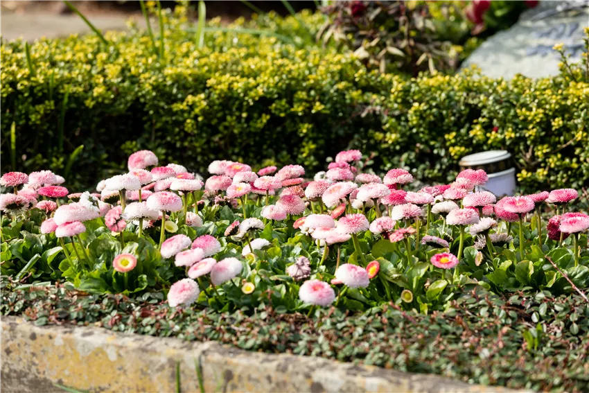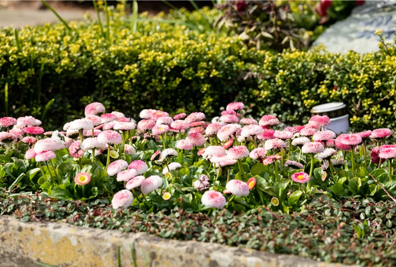 Une autre fleur printanière que vous pouvez également utiliser pour la plantation de tombes - avec des myosotis, des jacinthes et des jonquilles - est la pâquerette, connue sous le nom botanique de Bellis perennis. Si vous ne connaissiez jusqu'à présent que la petite pâquerette qui pousse généralement à l'état sauvage dans le gazon, vous serez émerveillé en voyant la pâquerette avec ses fleurs imposantes. Celle-ci existe principalement en rouge, jaune et blanc et, est nettement plus grande que les pâquerettes sauvages. La plante elle-même, qui peut atteindre une hauteur de 20 centimètres, est également plus grande que ses cousines sauvages. Pourtant, ces fleurs précoces n'ont besoin ni de fertilisations régulières, ni de soins coûteux. Grâce à sa floraison précoce et prolongée de mars jusqu'à la fin de l'été, vous pouvez même utiliser cette plante, également connue sous le nom de mille-fleurs, toute l'année pour fleurir vos tombes. Il est préférable de planter les Bellis perennis pré-cultivées en automne, afin qu'elles embellissent la tombe de leurs magnifiques fleurs dès le début du printemps.