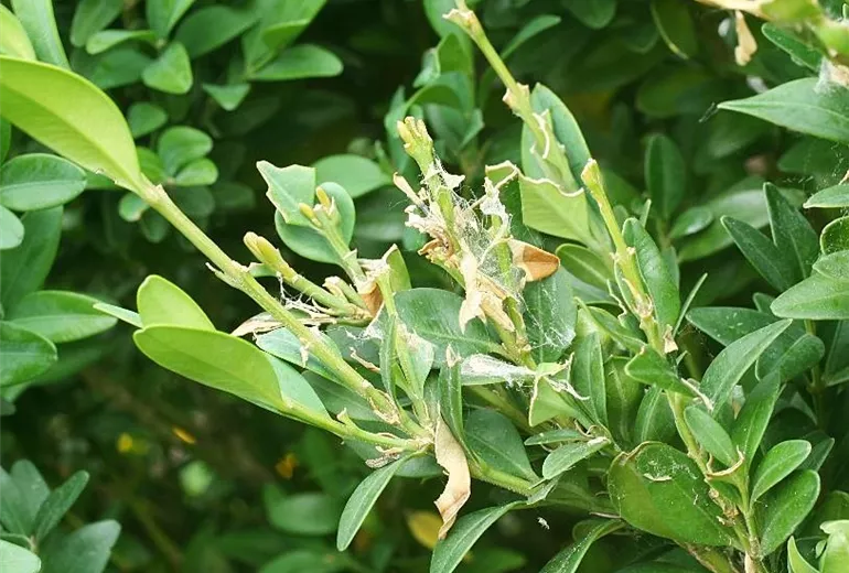 La pyrale du buis est un autre ravageur du jardin. Plus précisément, il s'agit des chenilles de la pyrale du buis, qui se nourrissent principalement de l’écorce et des feuilles du buis. La pyrale du buis elle-même, est un papillon nocturne qui pond ses œufs sur la face inférieure des feuilles de buis. Les larves éclosent ensuite des œufs. Vous pouvez reconnaître les chenilles en développement à leurs rayures jaunes, vertes et noires. L'infestation se reconnaît généralement aux nids formés de toile de la pyrale du buis. Les feuilles et l'écorce rongées, ainsi qu'une coloration brunâtre-jaune, sont également un signe d'infestation par les larves ou les chenilles de la pyrale du buis. En très peu de temps, les chenilles voraces atteignent jusqu'à cinq centimètres de long et dévorent des buis entiers. Les pousses rongées se dessèchent avec le temps, jusqu'à ce que finalement toute la plante meurt. En l'espace d'un an, au moins deux générations de ce ravageur du jardin se développent. Après avoir passé l'hiver dans leur cocon, les larves se réveillent dès le printemps et partent à la recherche de plantes à dévorer.
