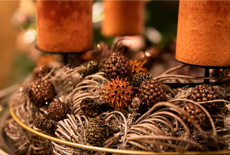 Que diriez-vous d'une couronne de l'Avent composée uniquement de petites pommes de pin décoratives ? Celle-ci peut également être décorée dans l'esprit de Noël, par exemple avec un nœud en velours rouge ou un ruban de jute rustique. Pour cela, il suffit d'entourer un anneau de fil de fer avec de la mousse et de coller les pommes de pin de mélèze - triées par taille - sur l'anneau de mousse. Les plus gros cônes sont placés à l'extérieur, les plus petits à l'intérieur. Entre ces deux rangées, il y a encore de la place pour une troisième rangée, où les plus petits cônes remplissent les espaces intermédiaires. Qui dit qu'une couronne de l'Avent doit toujours être rouge et verte ? Si vous souhaitez réaliser vous-même une couronne de l'Avent particulièrement romantique, vous pouvez la terminer en la vaporisant de peinture blanche, argentée ou dorée. Les couleurs des autres décorations et des bougies droites ou cylindriques peuvent également être adaptées. Les couleurs pastel comme le rose, le vert menthe ou un jaune délicat sont également des couleurs qui donnent à votre couronne de l'Avent un charme particulièrement individuel. Ça vaut donc la peine de fabriquer soi-même sa propre couronne de l'Avent.