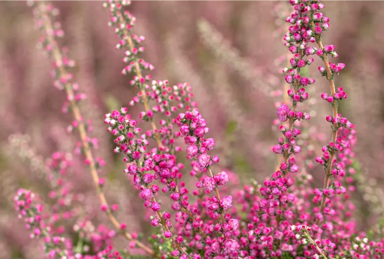 La calluna vulgaris ou bruyère, est souvent confondue avec la bruyère d'hiver qui fleurit en hiver. Cependant, la bruyère à balais fleurissant à la fin de l'été, est tout aussi résistante à l'hiver, surtout si elle pousse dans un sol plutôt pauvre en nutriments et légèrement acide. Même en hiver, il faut arroser régulièrement les plantes de bruyère. De nombreuses plantes ont tendance à se dessécher en hiver plutôt qu’à geler. Il en va de même pour la bruyère à balais résistante à l'hiver ou la bruyère d'hiver à la floraison abondante, qui nécessitent seulement une protection hivernale, elles sont cultivées en bacs. Cet arbuste nain est originaire des landes et des marais, et si les conditions du sol le permettent, fleurit presque sans interruption de la fin de l'été à la fin de l'automne. Les feuilles en forme d'écailles ainsi que les fleurs de différentes couleurs de cette plante de bruyère à feuilles persistantes, confèrent à la bruyère à balais son aspect caractéristique. Que ce soit dans un jardin de rocaille d'inspiration asiatique, dans un parterre classique de plantes vivaces avec des plantes de marais ou dans un jardin en jardinières sur le balcon ou la terrasse : avec la bruyère à balais Calluna vulgaris résistante à l'hiver, vous apportez des accents colorés à la grisaille de l'automne et de l'hiver.