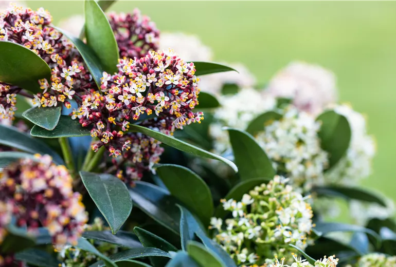 La skimmia du Japon ou Skimmia japonica montre ses fleurs rouges dès l'automne. Malgré sa floraison précoce, cette plante hivernale résistante au gel, conserve ses inflorescences tout au long de l'hiver. Elle est considérée comme une plante d'ornement assez peu exigeante et pourtant robuste, tolérant étonnamment bien les températures négatives au milieu de sa période de floraison. Cet arbuste ornemental à feuilles persistantes devient de plus en plus dense au fil des ans et peut atteindre une hauteur d'un mètre et demi, aussi bien en pot que dans un massif de plantes vivaces. Les feuilles vert foncé forment un beau contraste avec les fleurs rouge-brun et les baies rouge vif des plantes femelles. Au printemps, les inflorescences s'ouvrent avec les premiers rayons de soleil chauds et se transforment en fleurs blanches qui deviennent rapidement un spectacle inhabituel. Cette plante hivernale ne supporte pas trop le soleil, c'est pourquoi assurez-vous de la placer à un endroit semi-ombragé à ombragé. Cette plante d’ornement résistante au froid peut rester à l’extérieur toute l'année, même dans un bac sur le balcon, à condition d'être protégée par une protection hivernale.