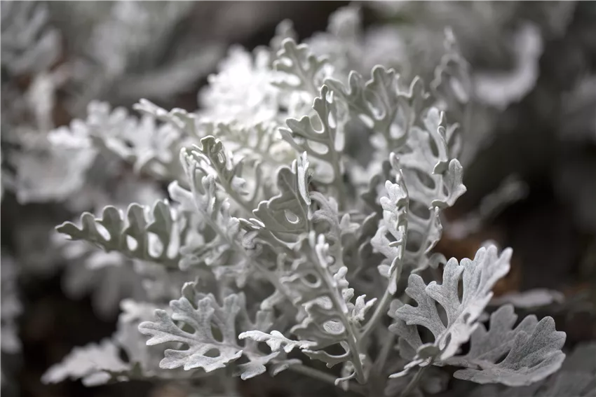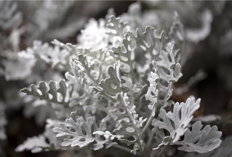 Une autre plante d’hiver presque fantomatique est le séneçon cinéraire (Senecio cineraria), qui forme un contraste intéressant avec des plantes vivaces et des plantes de balcon particulièrement colorées. Cette plante ornementale à feuilles est particulièrement attrayante en hiver, mais elle est aussi très sensible au gel. Ses feuilles plates de couleur blanc argenté à vert argenté, font de cette plante d’ornement, une plante idéale pour les jardinières de balcon en hiver, d'autant plus que le séneçon dépasse rarement les 40 centimètres de hauteur. Elle convient également à la plantation de tombes, dans des coupelles plates, et s’intègre bien en tant que bordure de massifs pour des plantes vivaces colorées. Le séneçon est en fait un arbrisseau et, en raison de sa sensibilité au gel, il fait partie des plantes annuelles dans notre région. Dans les régions particulièrement froides, vous pouvez toutefois mettre la plante à l'intérieur pour l'hiver. Le séneçon peut alors rester dans une pièce sèche, pas trop lumineuse et à l'abri du gel, jusqu'à ce qu’il n’y ait plus de risque de gelées tardives. Après avoir survécu à l'hiver, vous pourrez encore profiter de sa beauté particulière pendant une période prolongée et peut-être même voir la plante développer ses fleurs jaunes la deuxième année.