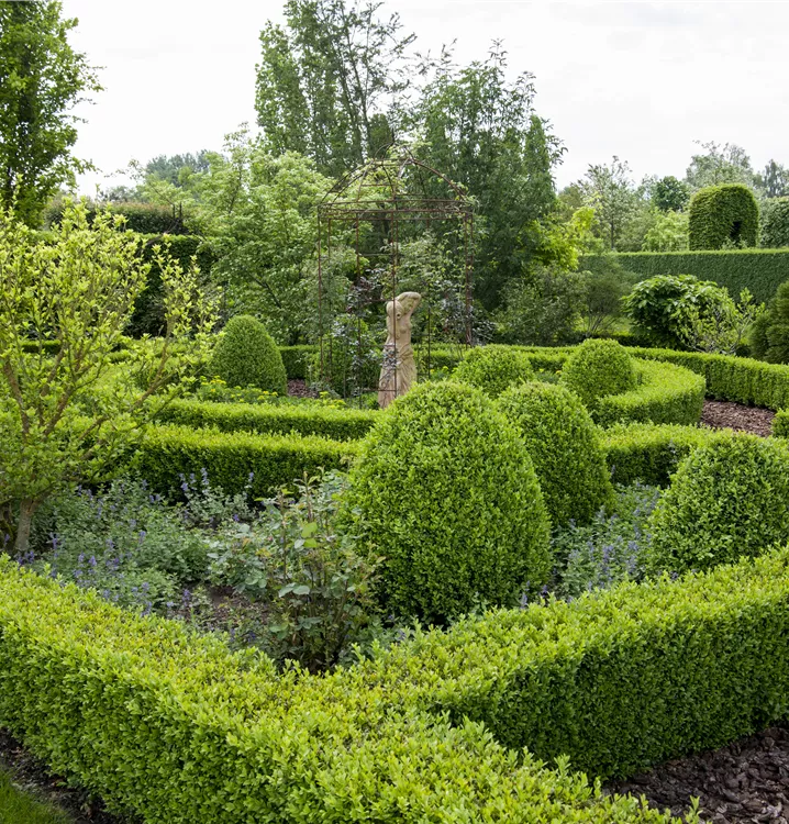 Le Buis commun (Buxus sempervirens) porte des feuilles persistantes rondes et entières, d'une belle couleur vert foncé. En tant que petit arbuste érigé et dense, le Buis commun atteint des tailles allant jusqu'à 1,5 m de hauteur et 1,5 m de largeur. Il est le mieux mis en valeur si vous lui donnez un emplacement ensoleillé ou ombragé, de préférence avec un sol perméable et meuble et un apport d'eau suffisant.