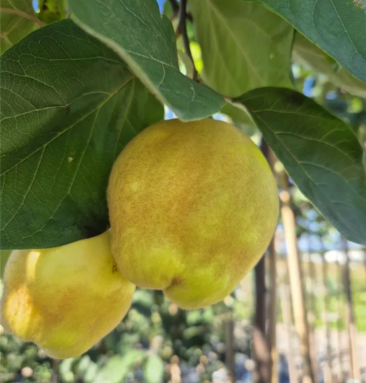 En jus, en confitures ou simplement frais comme en-cas, les fruits sucrés et acidulés du Cognassier 'Vranja' (Cydonia oblonga) sont bien sûr particulièrement délicieux lorsqu'ils sont récoltés par soi-même. À partir d'octobre, les fruits ronds sont mûrs pour la récolte. Ils sont alors de couleur jaune-vert. Pour une récolte abondante et des fruits savoureux, il faut donner à la Cognassier 'Vranja' un emplacement ensoleillé ou semi-ombragé, à l'abri du vent. L'idéal est une terre perméable et riche en nutriments, et bien sûr un apport d'eau suffisant. Avec son port érigé, large, touffu et dense, cette plante atteint environ 5 m de haut et 6 m de large. Il convient également de mentionner les fleurs rose clair en forme de coupe de la Cognassier 'Vranja'. Elles apparaissent de mai à juin et sont non seulement agréables à regarder, mais constituent également une source de nourriture pour les abeilles et autres insectes.