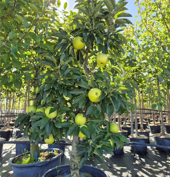 Les fruits sucrés et acidulés du Säulenapfel 'Lambada'® (Malus domestica) sont bien sûr particulièrement délicieux lorsqu'on les récolte soi-même. À partir de fin septembre, les fruits sont mûrs pour la récolte. Ils sont alors de couleur jaune et leur chair est ferme, juteuse et croquante. Pour une récolte abondante et des fruits savoureux, il faut donner au Säulenapfel 'Lambada'® un emplacement ensoleillé ou semi-ombragé. L'idéal est une terre perméable et riche en nutriments, et bien sûr un apport d'eau suffisant. Avec son port colonnaire, cette plante mesure environ 3 m de haut et 40 cm de large. Elle peut donc être cultivée en bac sur un balcon ou une terrasse, ce qui permet de gagner de la place. Il convient également de mentionner les fleurs rose clair du Säulenapfel 'Lambada'®. Elles apparaissent d'avril à mai et sont non seulement agréables à regarder, mais constituent également une source de nourriture pour les abeilles et autres insectes.