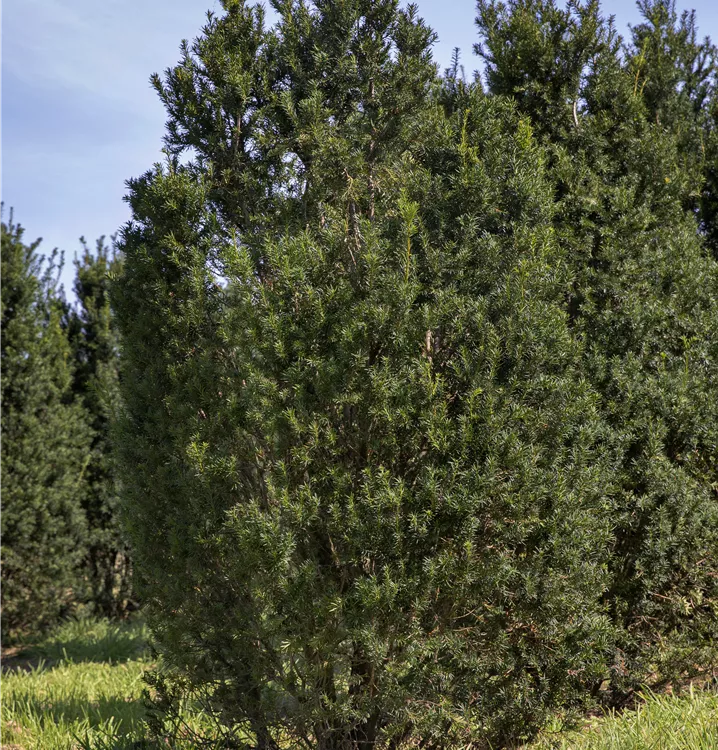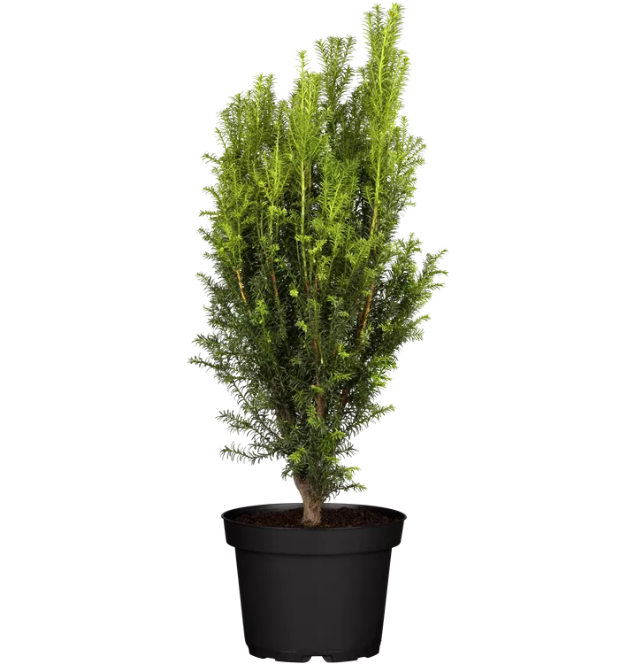 Le If commun 'Overeynderi'@ (Taxus baccata) porte des aiguilles persistantes d'une belle couleur vert foncé. Entre mars et avril, il produit des fleurs jaunes qui donnent naissance, en septembre, à des cônes rouges décoratifs ressemblant à des baies. En tant que grand arbuste conique à couronne fermée, le If commun 'Overeynderi' atteint des tailles allant jusqu'à 5 m de haut et 3 m de large. Il est le mieux mis en valeur si vous lui donnez un emplacement ensoleillé ou semi-ombragé, de préférence avec un sol perméable, calcaire et riche en nutriments, et un apport d'eau suffisant.